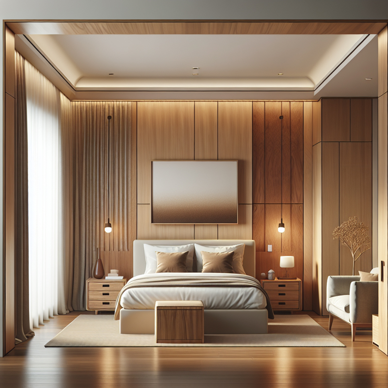 Soft, layered lighting with bedside lamps, LED strips, and dimmable ceiling fixtures for ambience