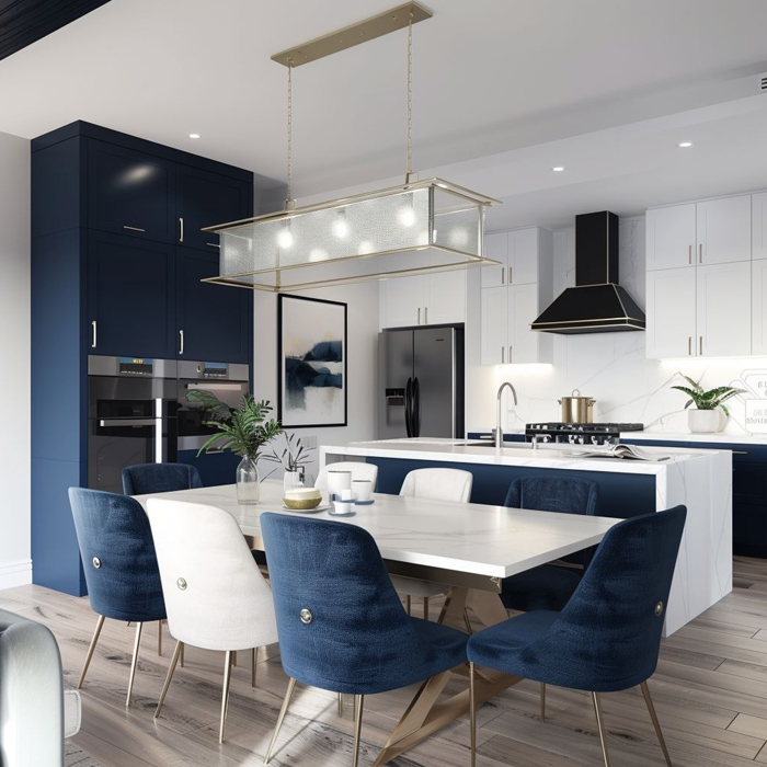 Install a chandelier, pendant lights, or layered lighting above the dining table to create focus and ambiance.