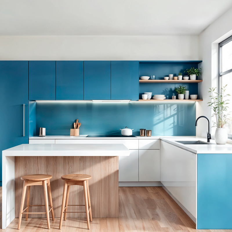 Shutter finishes define the kitchen's style and appeal. Laminates (matte or gloss) are durable and easy to maintain, acrylic offers a premium high-gloss look, PU finish delivers a seamless luxury appearance, and veneer adds a natural wood aesthetic.